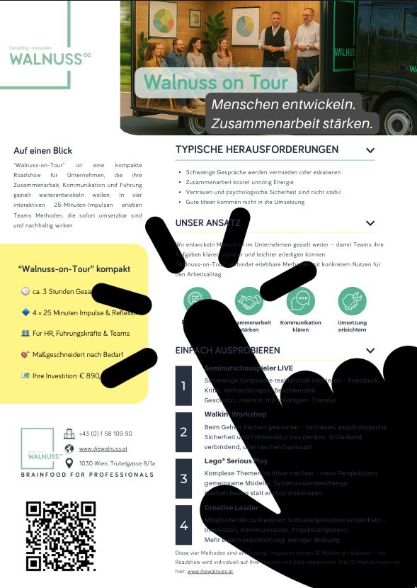 Viele Unternehmen wissen, dass es neue Impulse braucht, aber nicht immer, welche Methoden wirklich wirken. Walnuss-on-Tour macht diese Möglichkeiten sichtbar und zeigt, wie gezielte Trainings Zusammenarbeit, Kommunikation und Führung erleichtern.